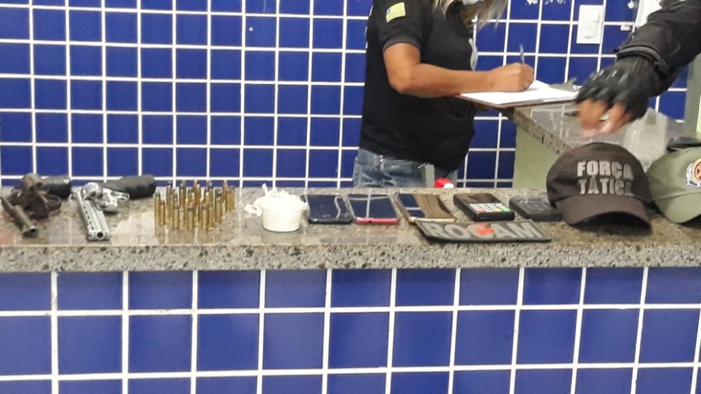 Com a fuga, os policiais iniciaram o acompanhamento tático. “Na Avenida 18 de Outubro, (o carro) foi interceptado e, durante as buscas, foi encontrado dois revólveres cal. 38, munições e substância análoga à cocaína, além de celulares e dinheiro”, acrescenta a PM.