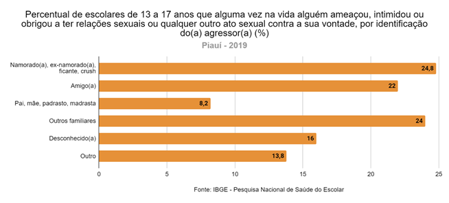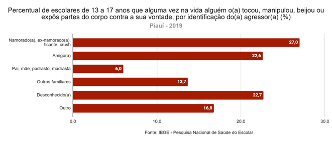 A Pesquisa Nacional de Saúde do Escolar (PeNSE) 2019 aponta que 12,8% dos estudantes piauienses de 13 a 17 anos de idade já sofreram importunação sexual. Conforme esses alunos, de escolas públicas e privadas, alguma vez na vida alguém o(a) tocou, manipulou, beijou ou expôs partes do corpo contra a sua vontade. A PeNSE é realizada pelo Instituto Brasileiro de Geografia e Estatística (IBGE). No Brasil, o índice foi de 14,6%. Entre os estados, o Piauí registrou a quinta menor proporção.