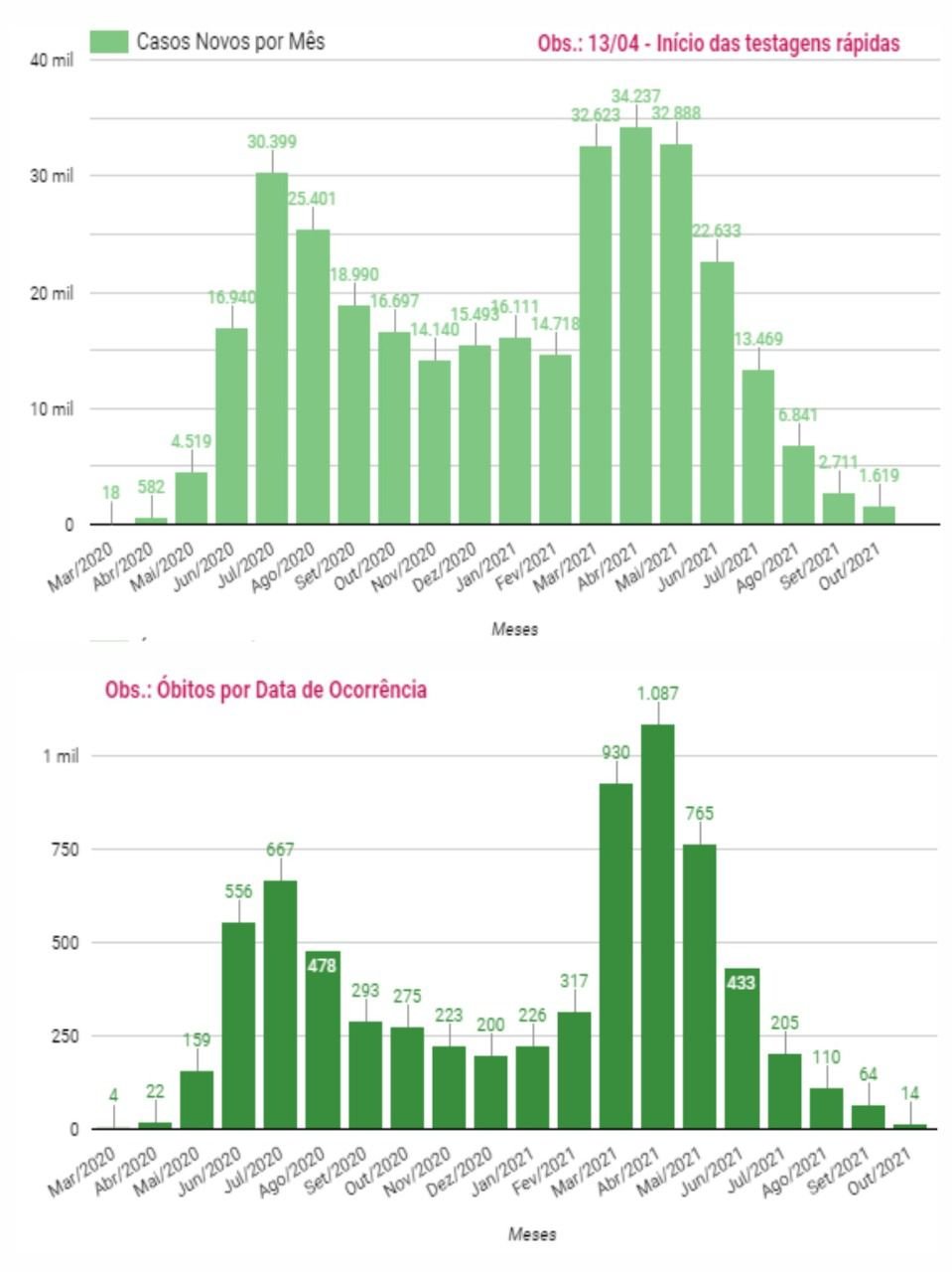 Os meses de março (930), abril (1.087) e maio (765) deste ano foram os que mais registram mortes em decorrência da Covid-19, quando foi constatado o pico da pandemia no estado. A partir do mês de julho, com um crescimento do número de pessoas vacinadas, os números das mortes pela doença começam a apresentar uma queda, que foi se consolidando nos meses seguintes, chegando ao menor patamar em setembro.