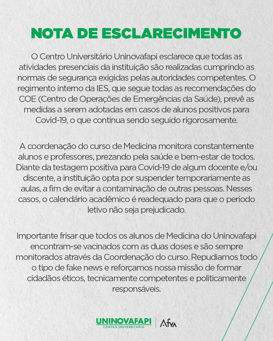 A assessoria de comunicação da Uninovafapi enviou através de email uma nota de esclarecimento