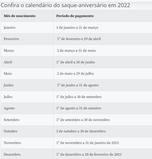 O período de saques começa no primeiro dia útil do mês de aniversário do trabalhador. Os valores ficam disponíveis até o último dia útil do segundo mês subsequente. Caso o dinheiro não seja retirado no prazo, volta para as contas do FGTS em nome do trabalhador.