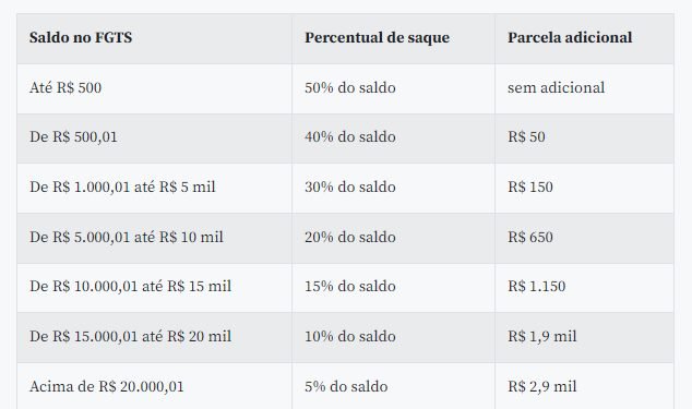 O valor a que o trabalhador que aderiu ao saque-aniversário tem direito a retirar a cada ano depende do saldo em cada conta do FGTS. Para contas com saldo de até R$ 500, poderá ser retirado 50% do total. A partir daí, o percentual cai, mas será paga um valor fixo adicional, que aumenta conforme o saldo total. O cálculo ocorre da seguinte forma.
