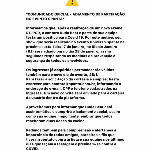 Duda reforçou ainda que ela e toda sua equipe receberam as duas doses da vacina contra a Covid-19 e pediu que quem teve contato com ela nos últimos dias que faça o teste. O show que ela faria no dia 07 de janeiro no Rio de Janeiro ficou remarcado para 28 de janeiro.
