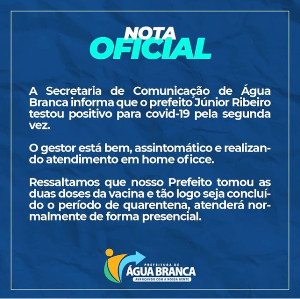 Uma nota oficial divulgada neste domingo (9) pela Prefeitura da cidade de Água Branca, informa que o prefeito da cidade, Júnior Ribeiro, testou positivo para covid-19 pela segunda vez. O gestor está em isolamento domiciliar e não apresenta sintomas fortes da doença.