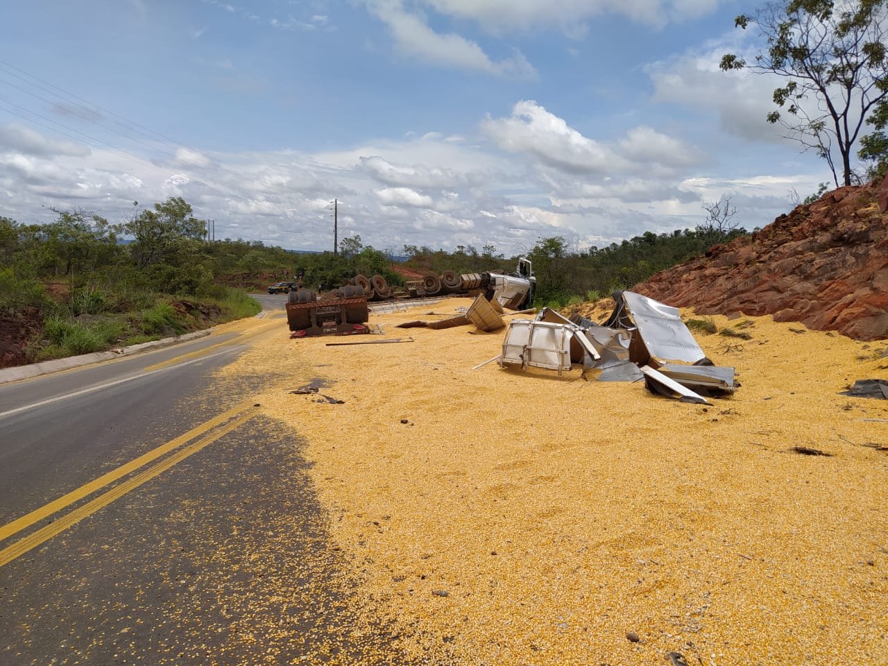 Uma carreta carregada de milho tombou na BR-135, no KM 545, na descida da Serra de São Gonçalo do Gurgueia, no Sul do Piauí, por volta das 8h de quarta-feira (26). O passageiro de 14 anos, filho do motorista, ficou com ferimentos graves.