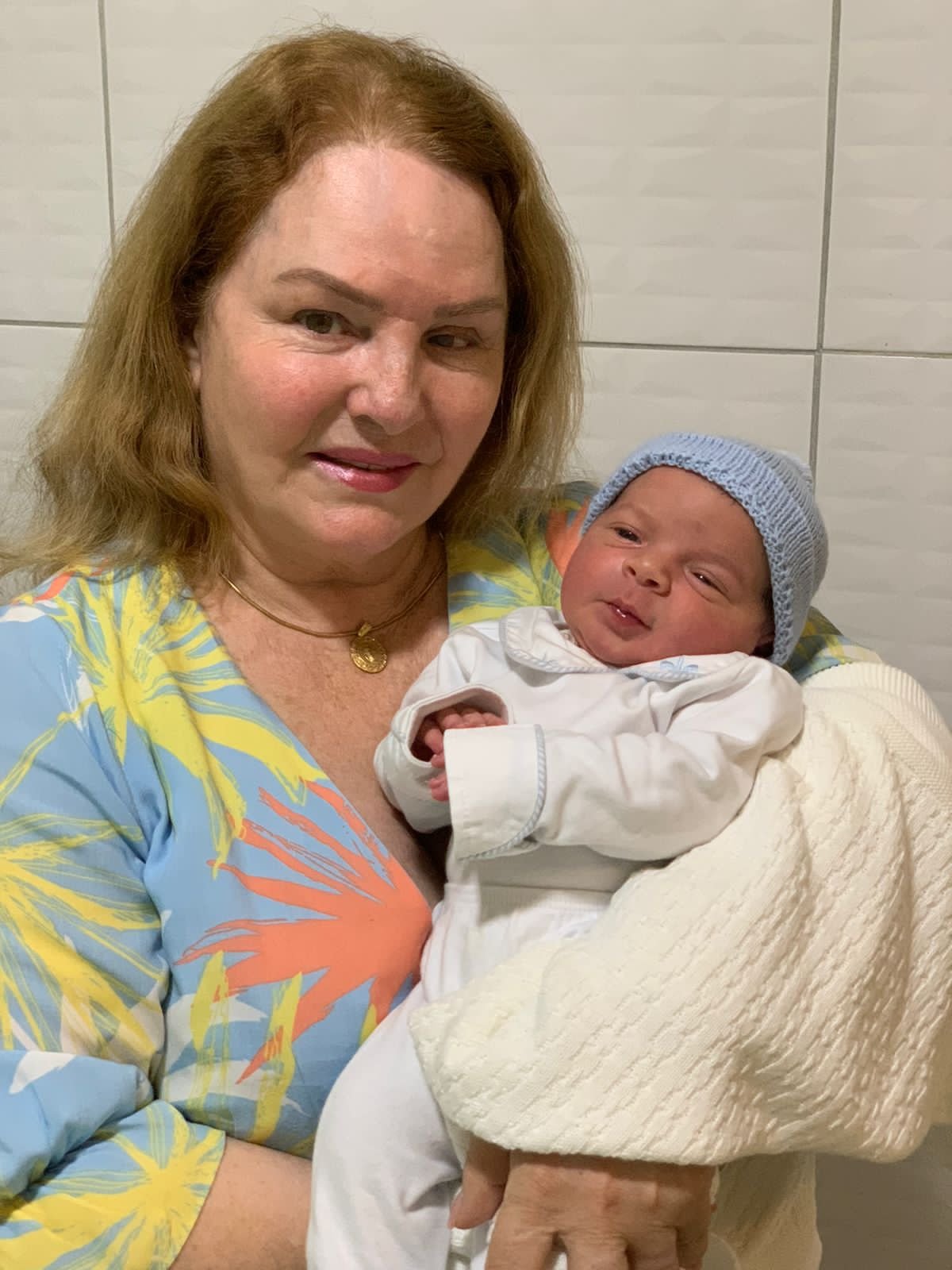 A chique Nelci Grass segurando o seu netinho Arthur que nasceu ontem com 52 cm e 3.860 kg.