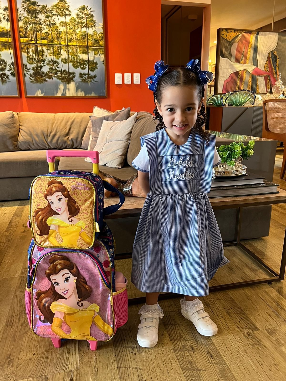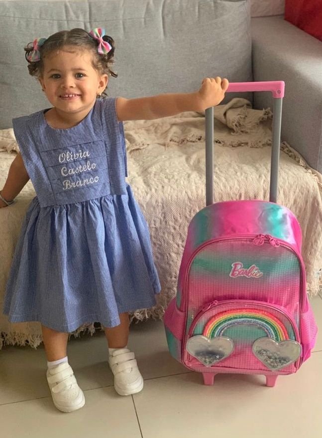 A fofíssima Olívia Castelo Branco de saída para o seu primeiro dia de aula.
