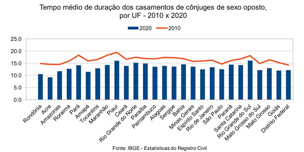 No Piauí, o tempo médio entre a data do casamento e a data do divórcio era 19,4 anos em 2010. De acordo com a pesquisa, a média reduziu para 16 anos em 2020. Já no Brasil, o tempo médio era de 15,9 anos em 2010, número que caiu para 13,3 anos em 2020.