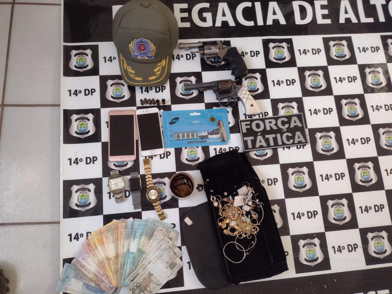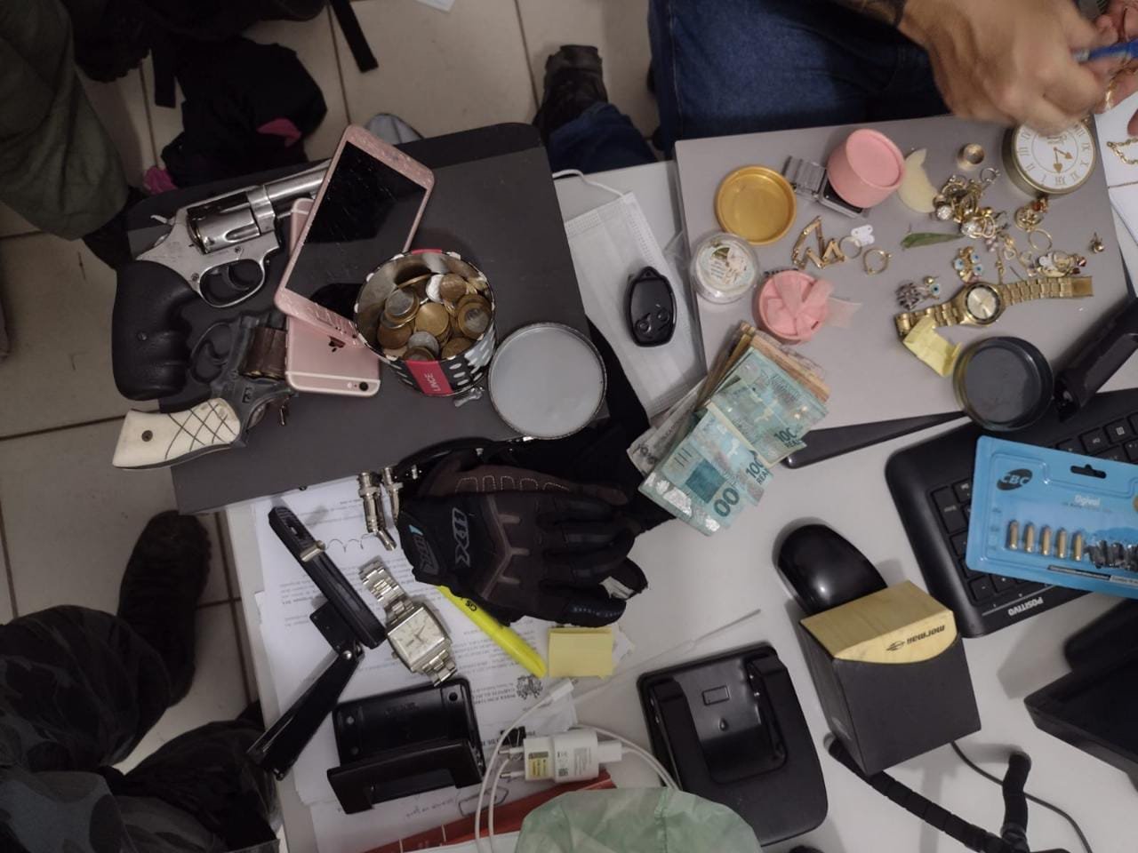 As equipes policiais apreenderam: dois notebooks, gravador digital, dois revólveres, munições, relógios, roupas, sapatos, um estojo com semijoias, celulares e pouco mais de R$ 2 mil em espécie.