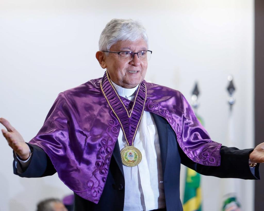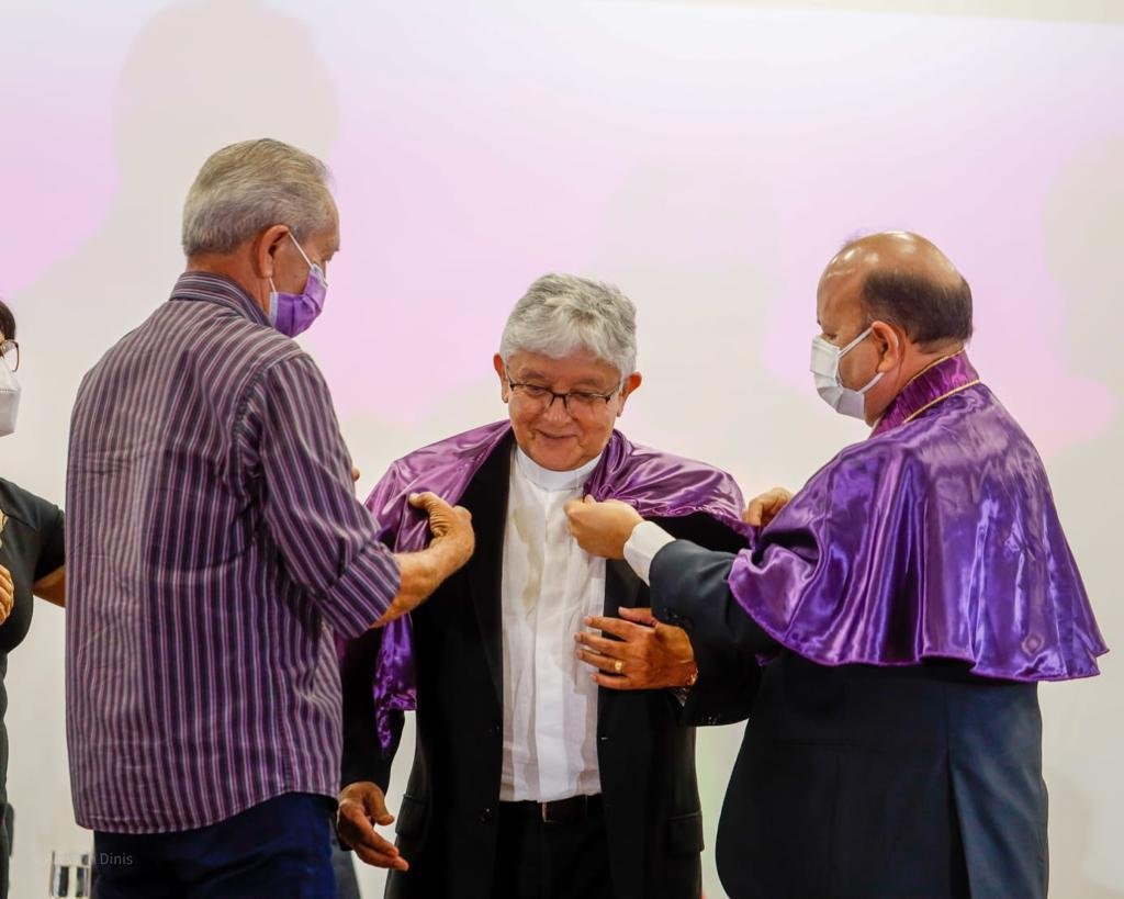 Após ser empossado e diplomado, o religioso recebeu as insígnias acadêmicas, pelerine e colar das mãos do seu neto, o pequeno Pedro Enzo Batista, e do seu irmão, Geraldo Batista.