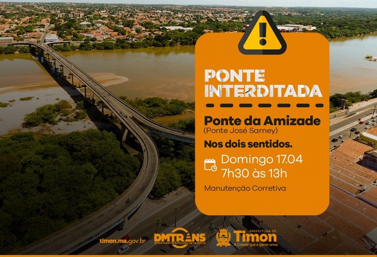 O Departamento Municipal de Iluminação Pública de Timon – DMIP informa que realizará uma manutenção corretiva na iluminação da Ponte Presidente José Sarney (Ponte da Amizade) neste domingo, 17 de abril.