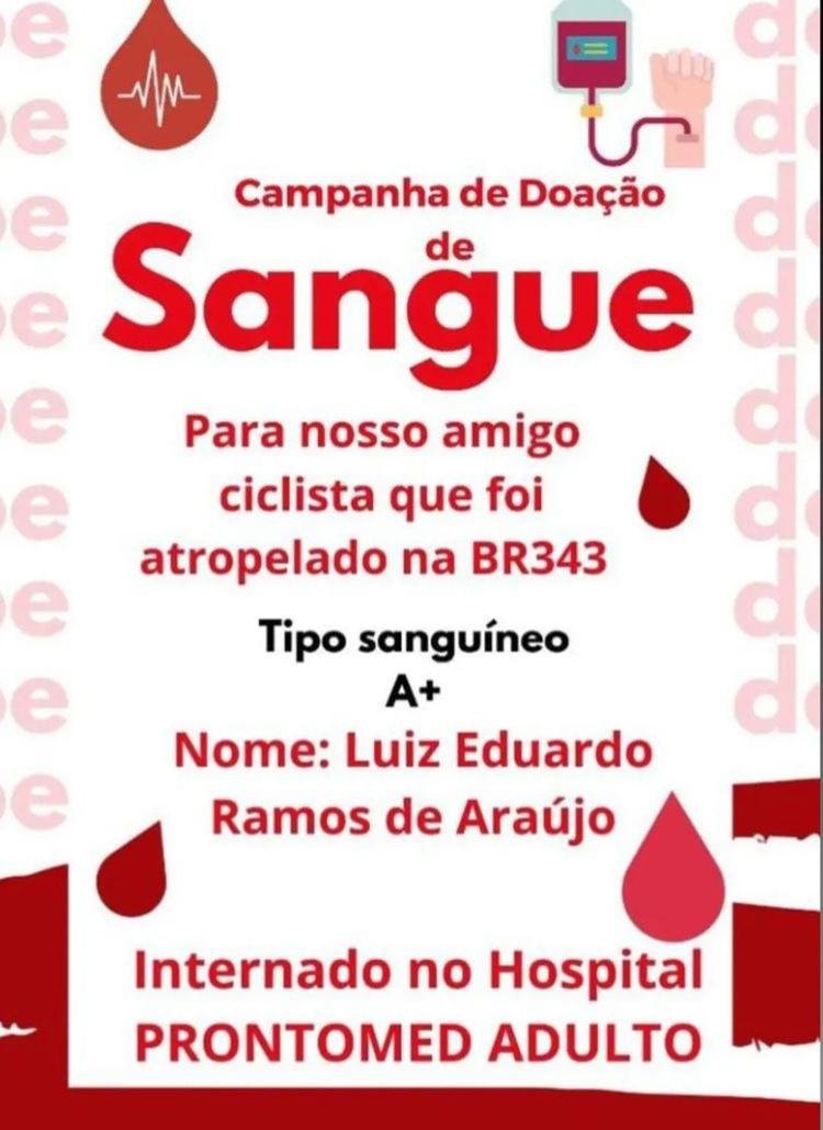 Familiares e amigos do ciclista Luiz Eduardo Ramos de Araújo, vítima de um atropelamento na noite desta terça-feira (3) na BR-343, entre Teresina-Altos, começaram uma campanha nas redes sociais pedindo que pessoas doem sangue para o esportista.