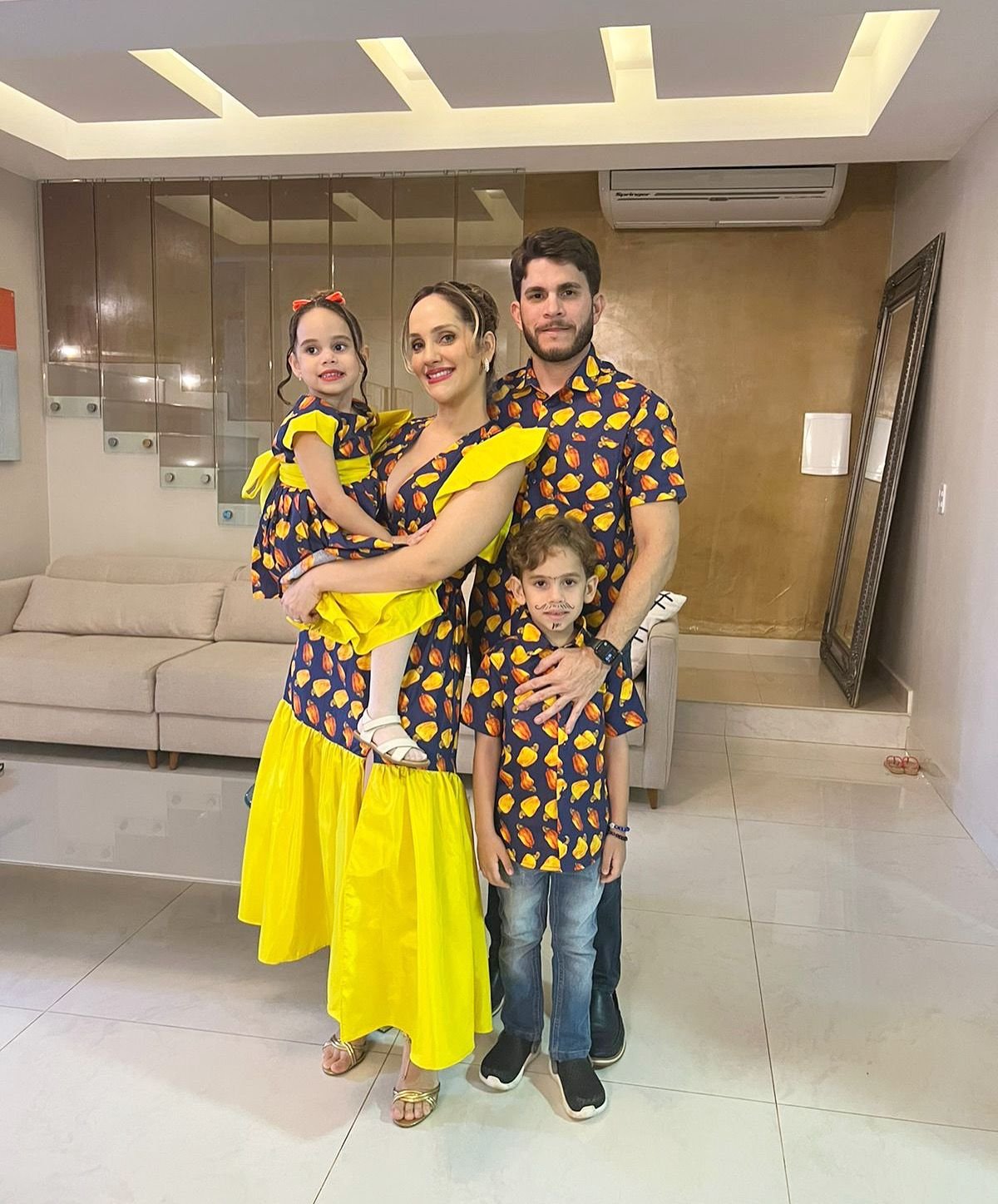 Valéria Macêdo e Thiago Evangelista com os filhos José e Luísa em ritmo junino.