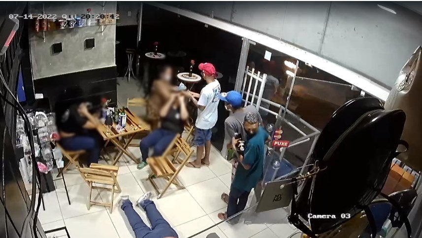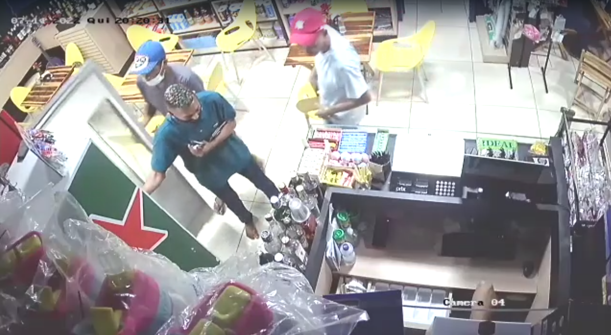 Nas imagens da câmera de segurança, eles rendem clientes na porta do comércio e deitam um homem no chão. Dois entram na loja e abordam o caixa. Além de roubar os pertences dos clientes, como celular, dinheiro em espécie e carteiras, os criminosos enchem as mãos e bolsos com produtos do estabelecimento e deixam o local.