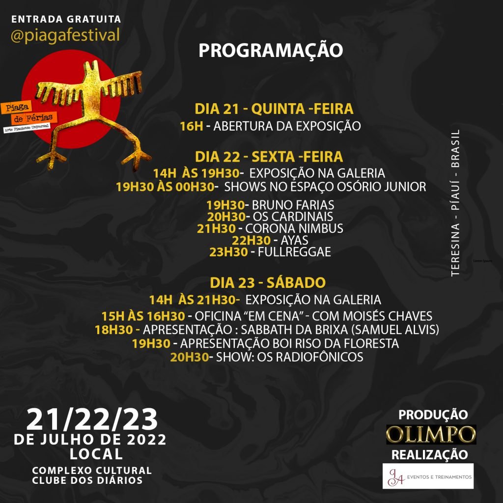 Nomeado Piaga de Férias, o festival terá programação também nesta sexta (22) e sábado (23). Essa edição vai contar com uma galeria composta de 42 expositores entre telas, fotografia e artesanato. Nesta quinta a abertura do evento irá iniciar por volta das 16h.