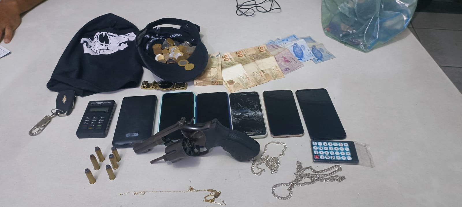 Além da arma, foram apreendidas seis munições intactas, dois colares de ouro, cinco aparelhos celulares, carregadores de celulares, um veículo modelo ônix branco, cinco aparelhos celulares e uma quantia de R$ 264.