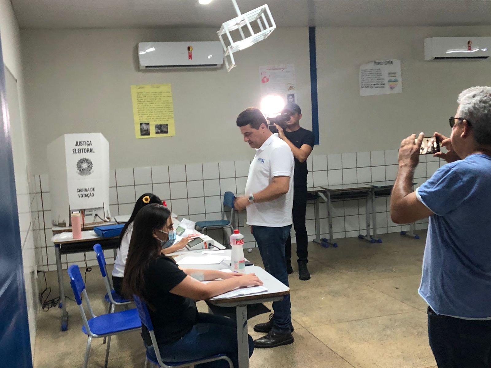 O candidato Gustavo Henrique (Patriotas) votou acompanhado da família e do seu candidato a vice-governador Domingos Bezerra (Patriota), no Colégio Premen Norte, no bairro Vila Operária, zona Norte de Teresina.