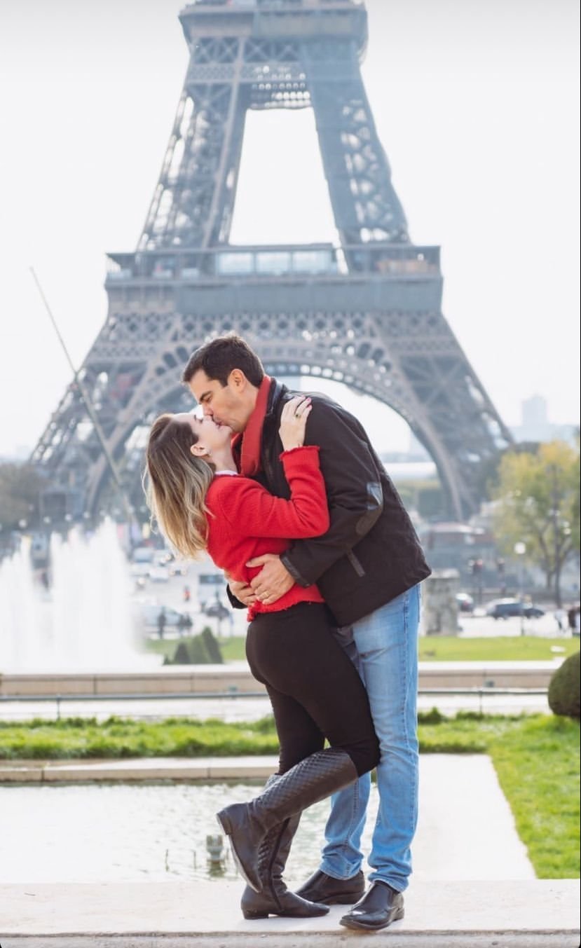 Rebeka Coelho Carvalho e Vinícius Carvalho em clique apaixonado em Paris.