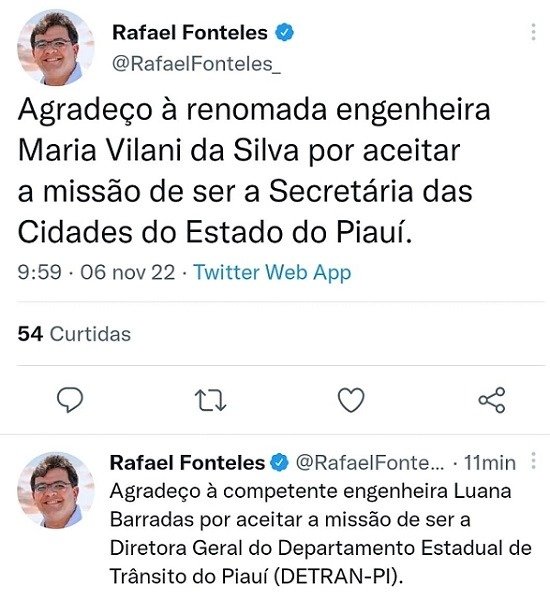 O governador eleito do Piauí, Rafael Fonteles (PT), utilizou as redes sociais para anunciar mais dois nomes do novo secretariado. A engenheira Maria Vilani da Silva assumirá a Secretaria das Cidades do Estado e a engenheira Luana Barradas será a Diretora Geral do Departamento Estadual de Trânsito do Piauí (DETRAN-PI).