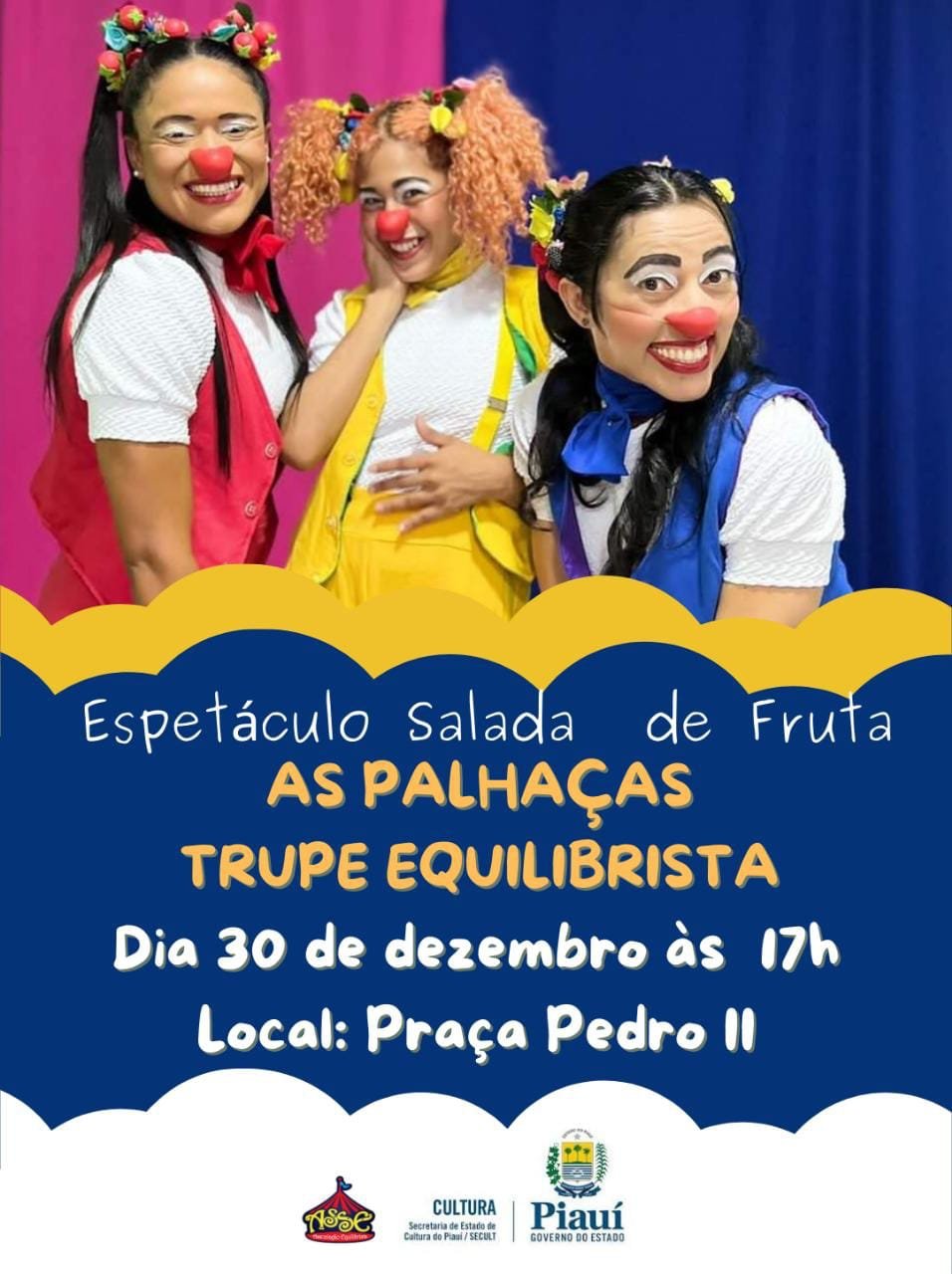 Uma apresentação circense de palhaços está marcada para ocorrer às 17h desta sexta-feira (30) em frente ao Theatro 4 de Setembro, na praça Pedro II, do Centro-Sul de Teresina. O espetáculo Salada de Fruta leva cenas da palhaçaria, acrobacia e equilíbrio para animar todas as crianças da região.