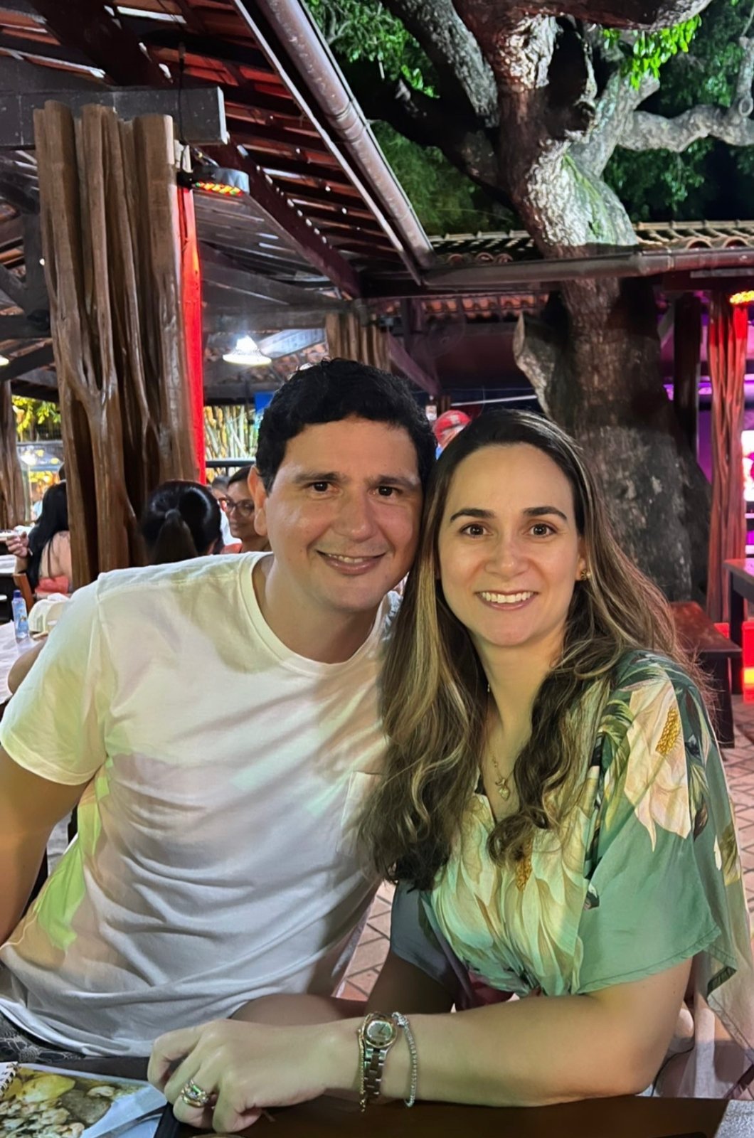 O casal Fábio Araújo e Marina Tajra Araújo na Praia do Forte.