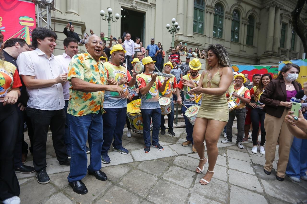 Acompanhado de uma sambista, o prefeito mostrou animação com a proximidade das festas carnavalescas ao lançar a programação ao som da bateria do grupo Piauí Samba.