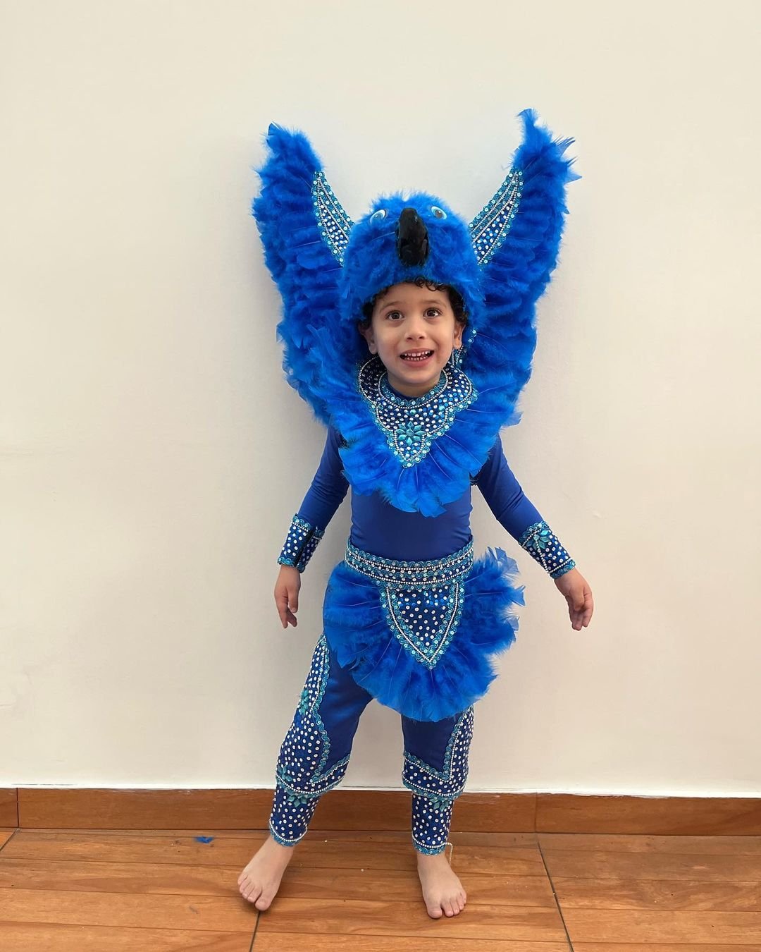 Já para o concurso, Pedro foi ousado e representou o Brasil com o traje típico de Arara Azul: “uma espécie de arara que se destaca pela beleza de suas penas azul-cobalto e por seu tamanho, sendo a maior espécie do grupo dos psitacídeos, é uma espécie de ave, encontrada no BRASIL”, disse a mãe, Taciana.