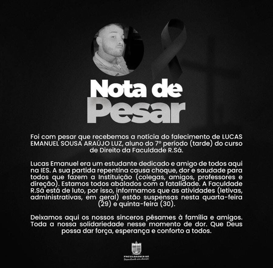 Lucas cursava o 7º período de Direito em uma faculdade particular na cidade. A instituição publicou uma nota de pesar e decretou luto oficial de 3 dias. As aulas foram suspensas nesta quinta-feira (30).
