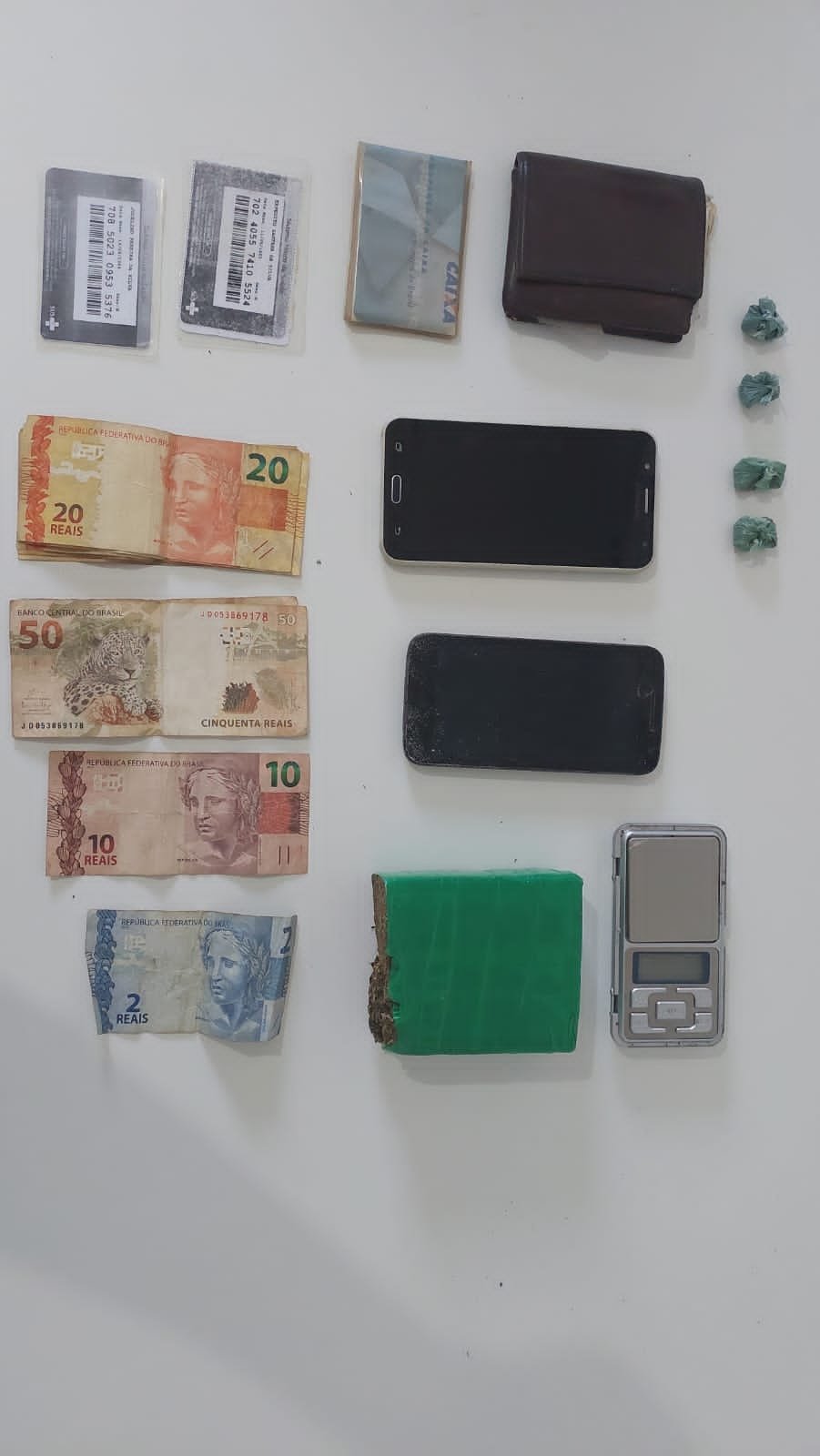 Na residência de um dos suspeitos, foram apreendidos um tablete de maconha, dinheiro, aparelhos celulares e uma balança de precisão. Outro homem, identificado como A.J.D.N., também foi conduzido, mas não foi contatado envolvimento com o tráfico de entorpecentes. Ele foi ouvido como testemunha e, em seguida, liberado.