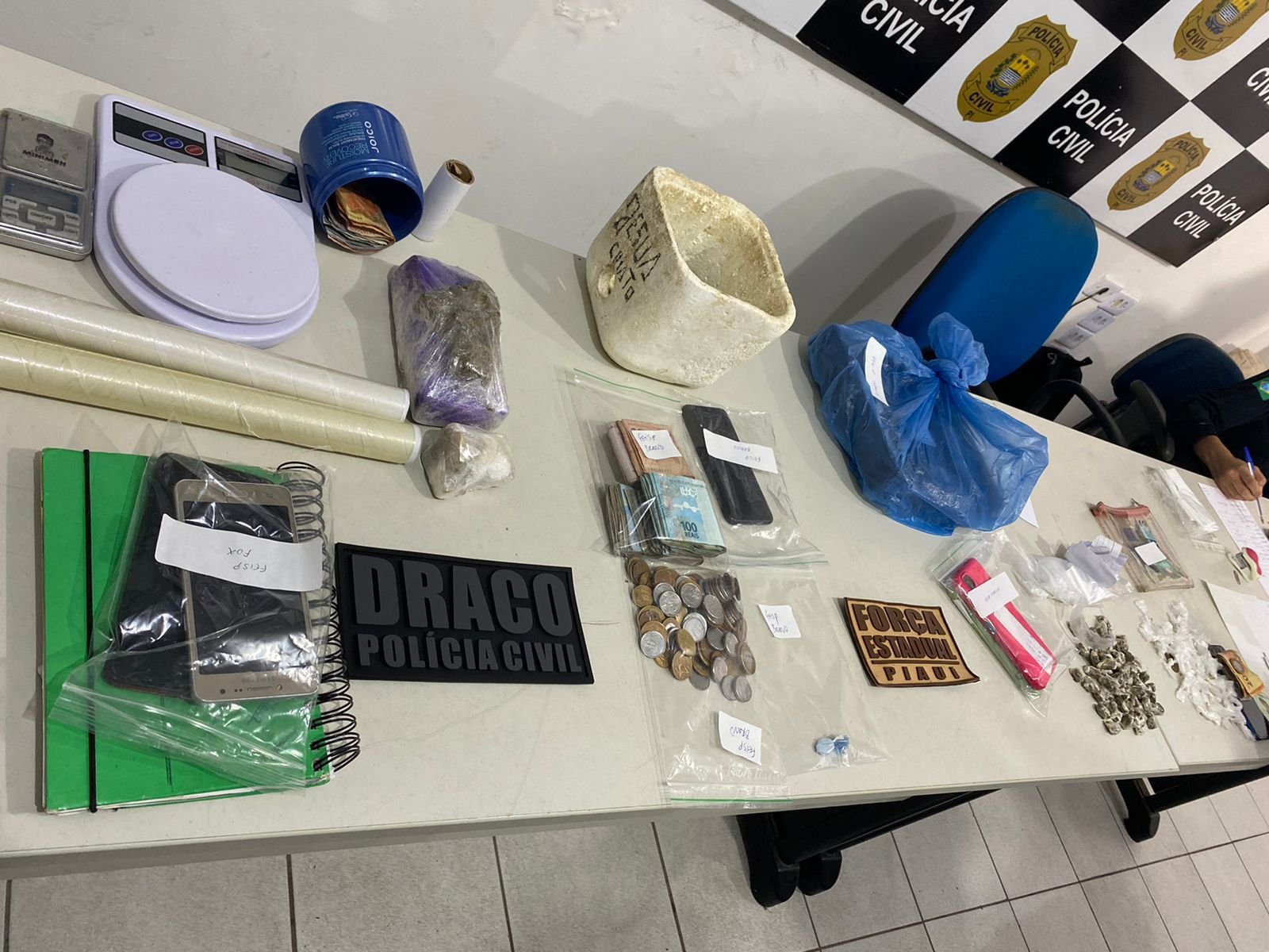 A Polícia Civil informou que “no momento da abordagem policial foram apreendidas drogas, balança de precisão, dinheiro trocado, produtos provenientes de roubos e anotações relacionadas a atuação dessas organizações criminosas que podem resultar em futuras operações”.