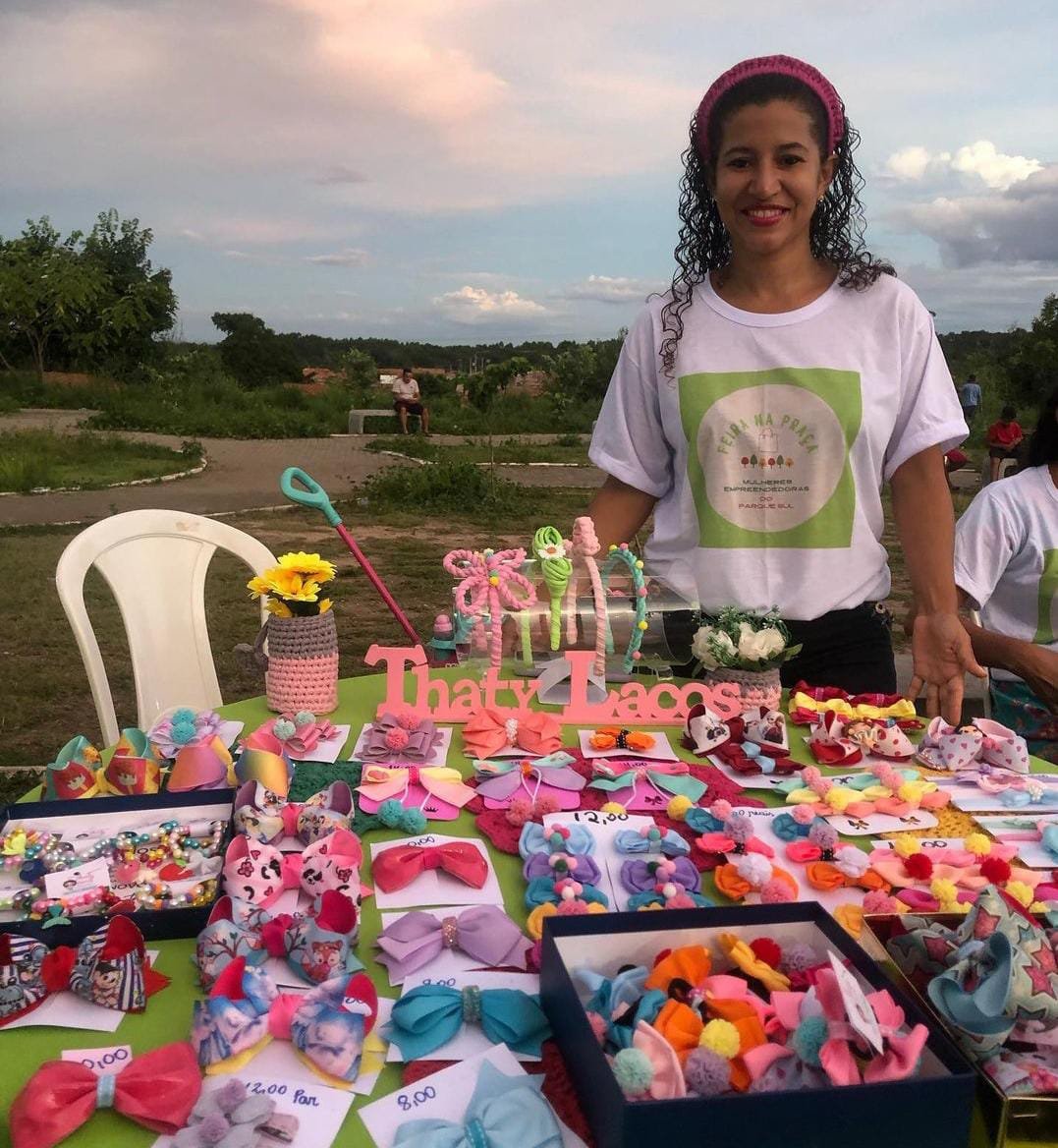 A Feira na Praça coleciona histórias de mulheres que alcançaram maior prosperidade nos negócios. Uma delas é a Thatiana Ribeiro, artesã de acessórios infantis que encontrou, no empreendedorismo, uma fonte de renda após fechar sua academia de ginástica.