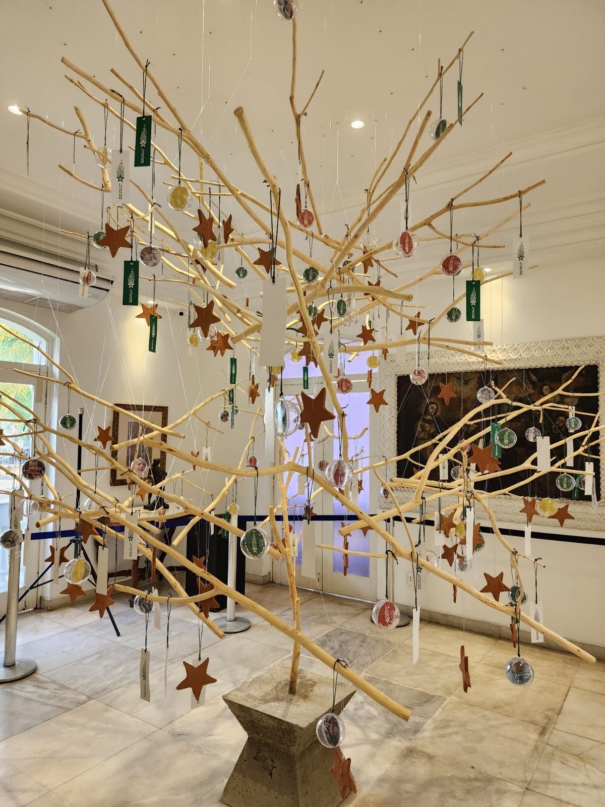 “Os galhos são pendurados no teto, de onde embalam, protegidos dentro de uma bola, como frutos futuros, com fotos de parte das crianças nascidas no Piauí no primeiro ano deste novo governo. Foi apostando nesta geração que desenhará o futuro do Piauí que criamos este Natal”, declara o artista plástico Áureo Júnior.