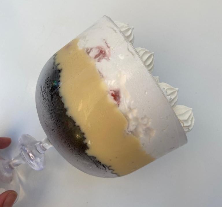– Coloque a base de bolacha no fundo da travessa (cerca de 1200 ml). Em seguida, coloque todo o creme branco, faça uma camada com morangos frescos picados, acrescente a mistura de chantilly com morangos e finalize com suspiros.