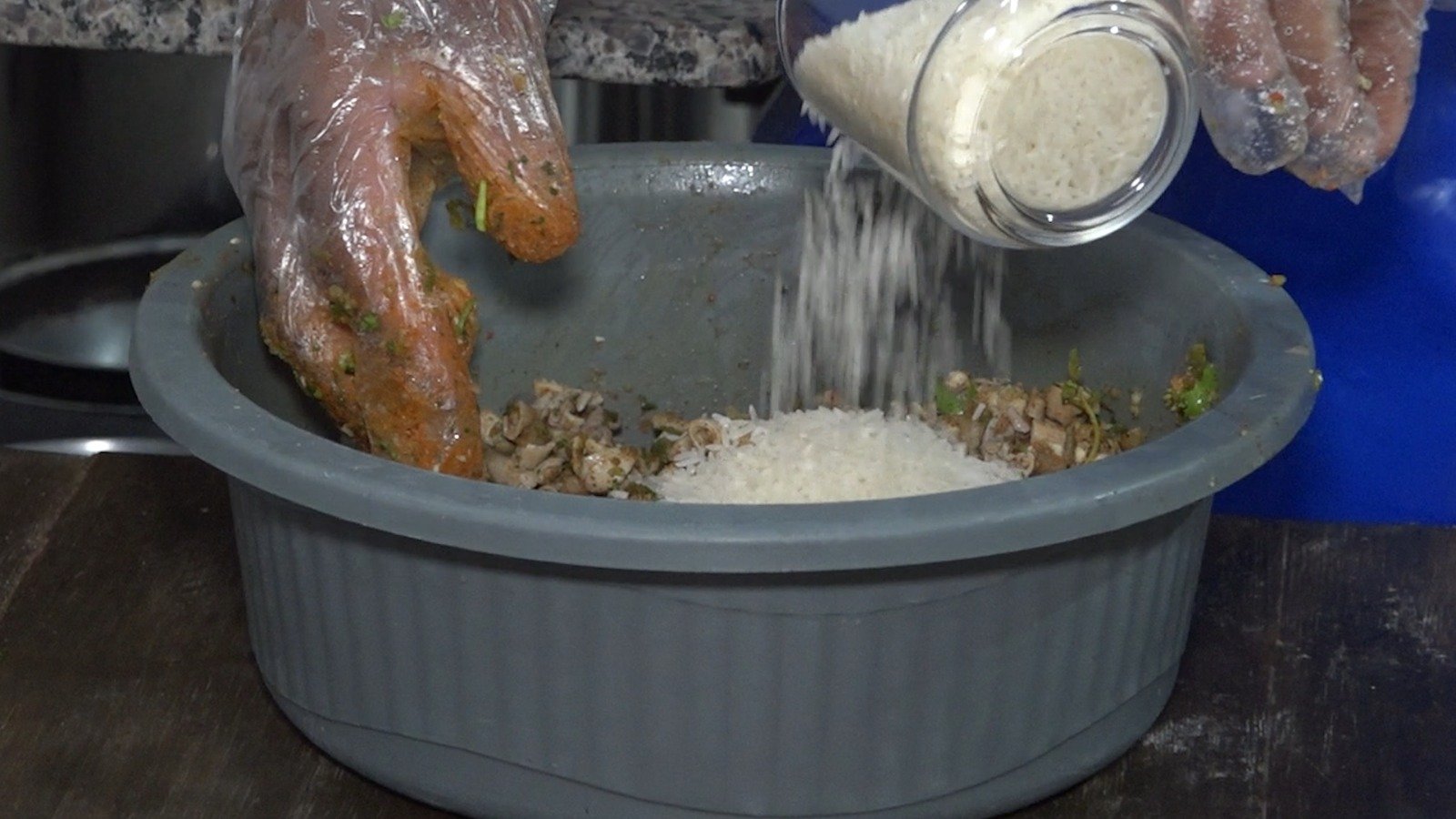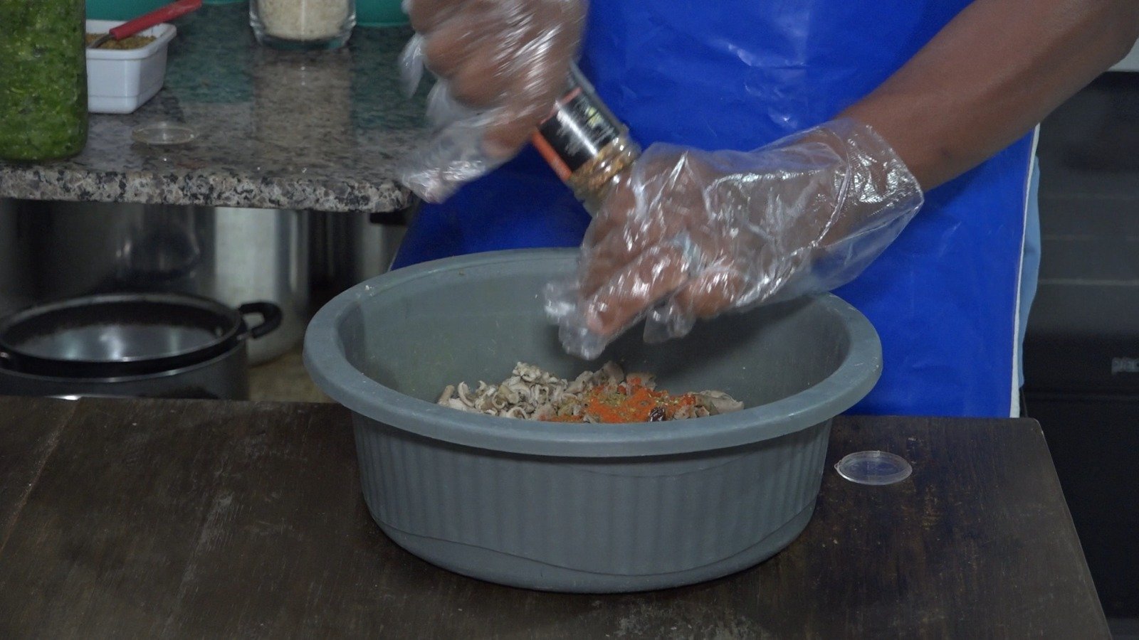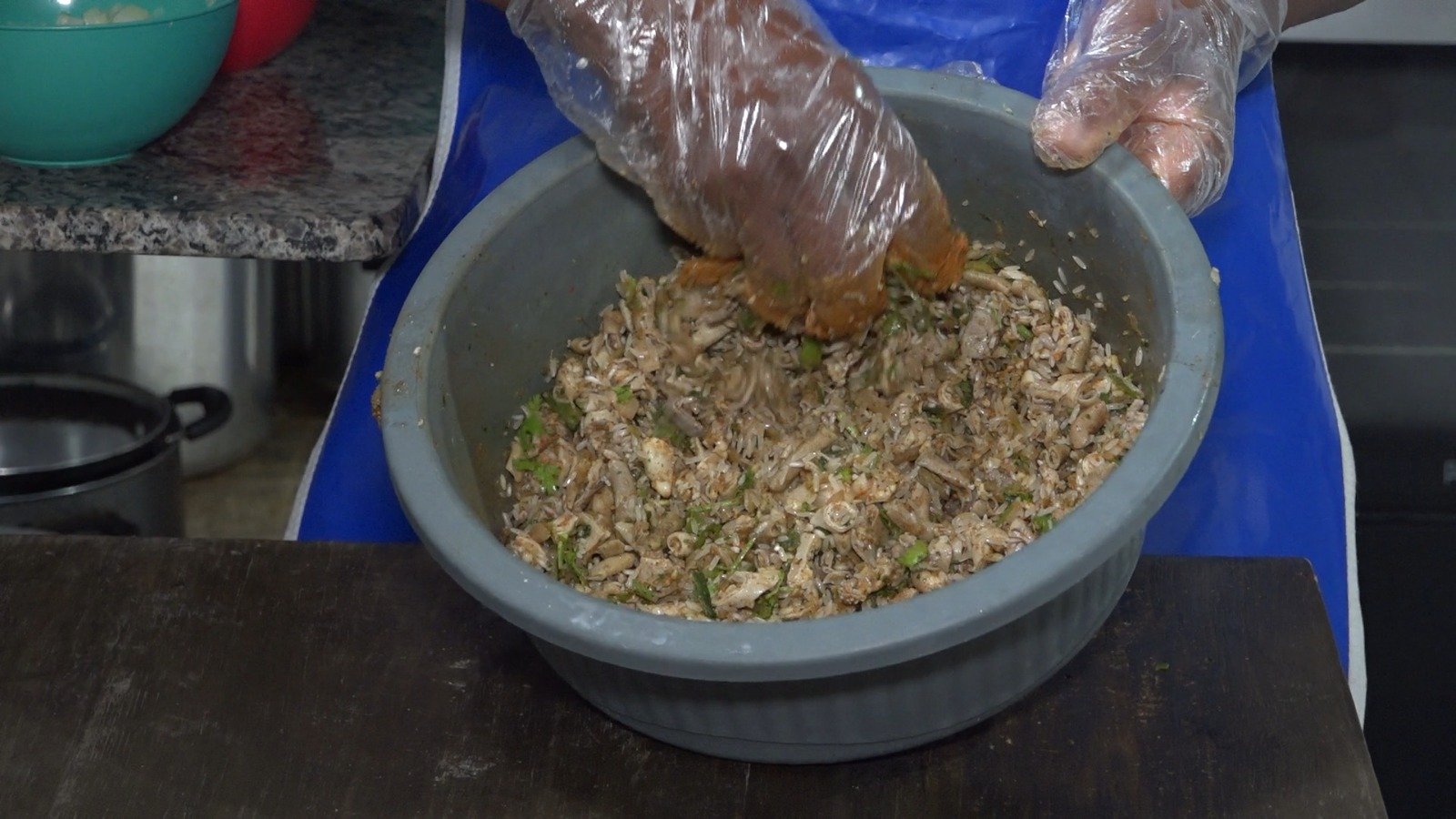 O culinarista explica que deve se misturar todos os temperos e rechear o bucho: “Vamos fazer duas buchadas, uma com arroz e a outra só com temperos”.