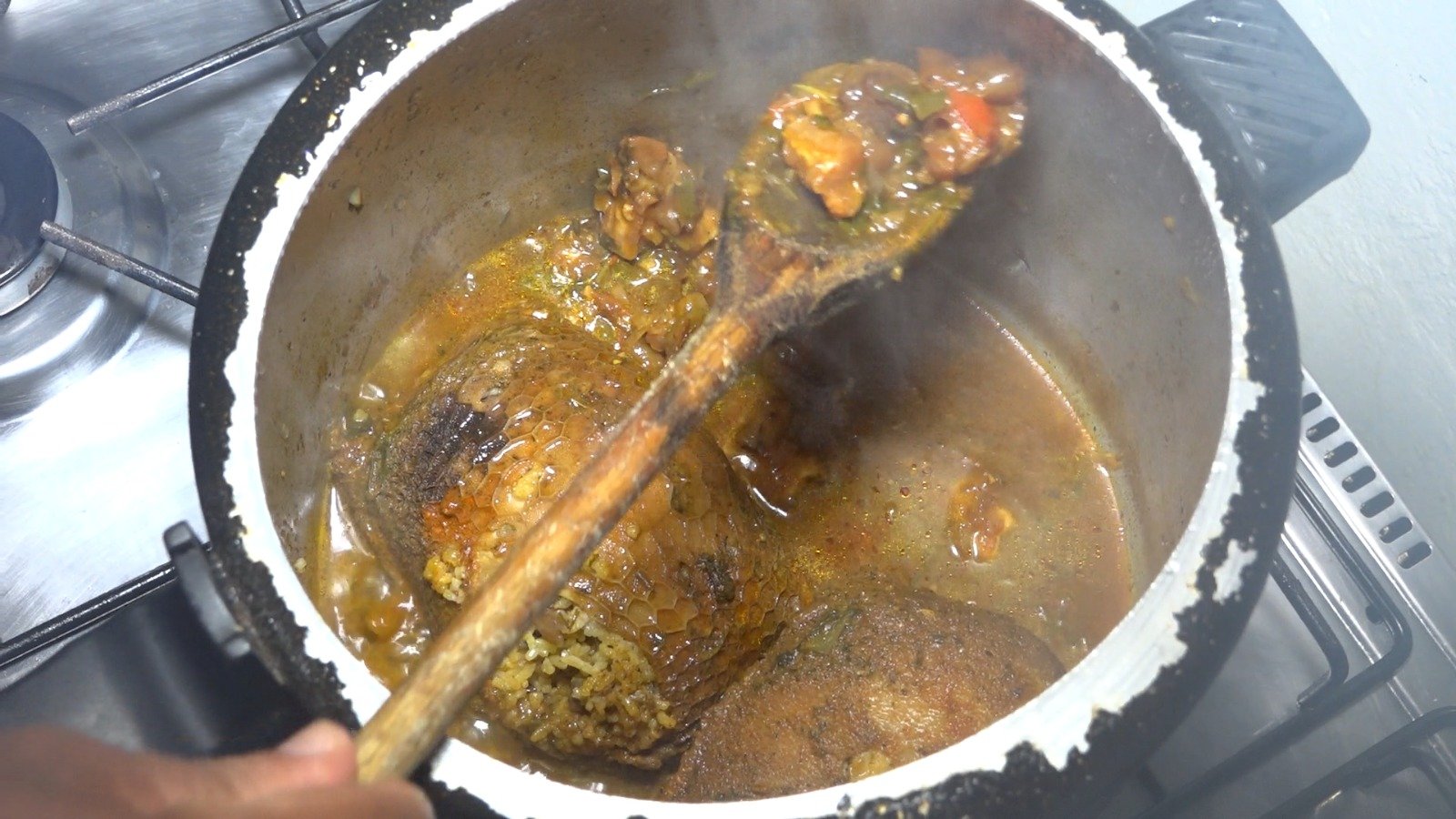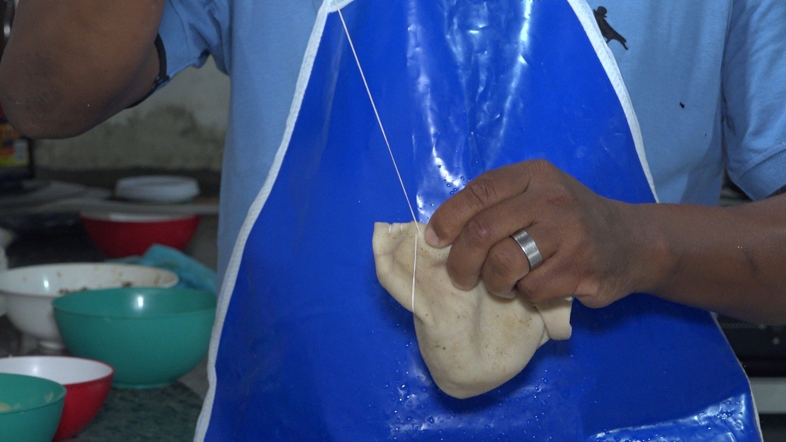 “Colocamos o arroz, sendo que a quantidade vai da sua preferência, e ele vai cru. Leva de 40 a 50 minutos para cozinhar. Com a outra metade do bucho, vamos rechear e costurar. Usamos uma linha 0, conhecida como linha de pipa”.