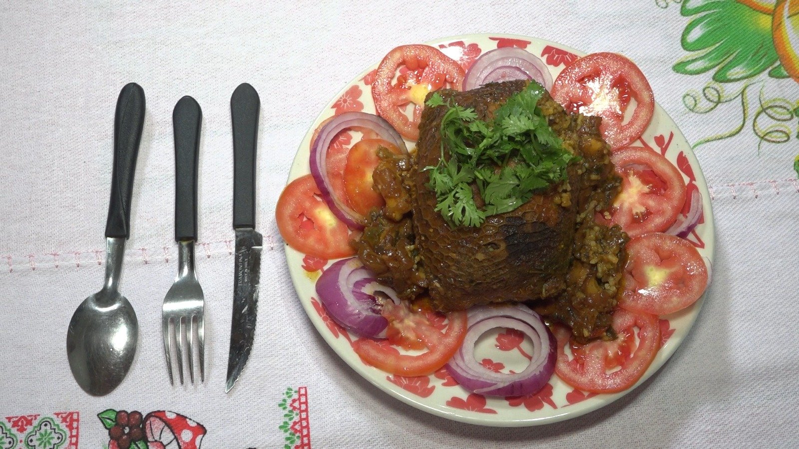 O prato é feito com tripas e estômago de animal; a parte das vísceras são lavadas, fervidas e temperadas para dar um sabor especial.