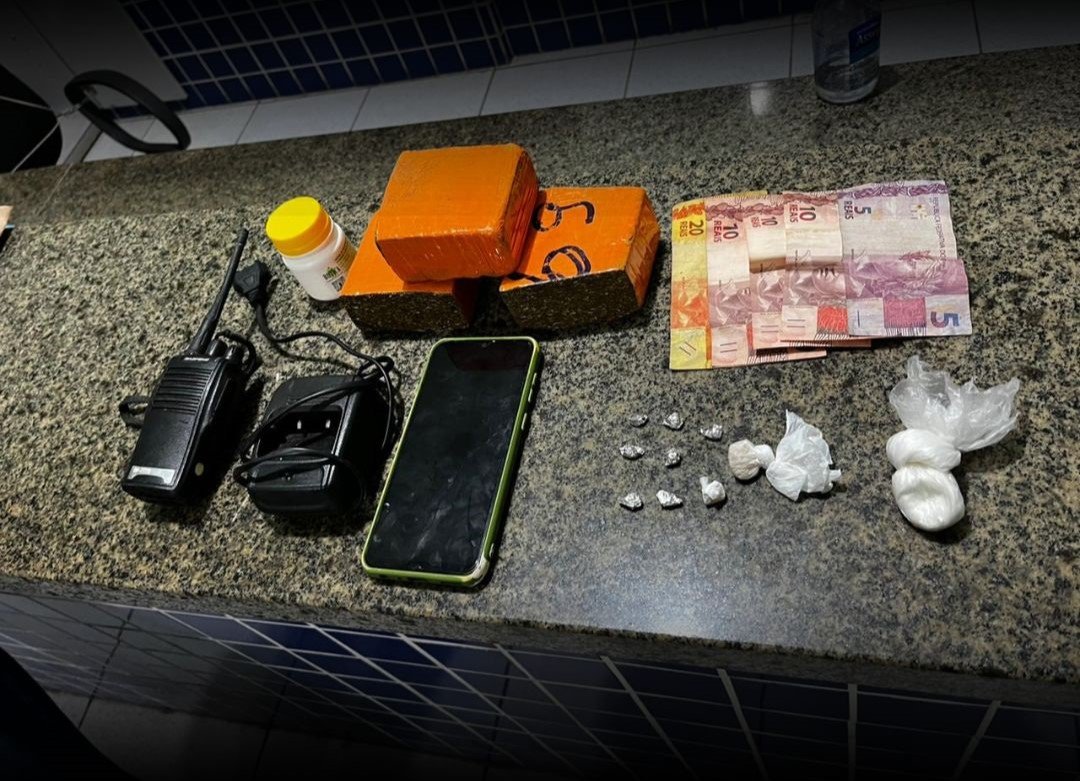 Durante a operação foram encontradas sacolas plásticas com drogas enterradas na casa da suspeita. Foram apreendidos três tabletes de maconha, porções de crack e cocaína, rádio comunicador, dinheiro, além de um aparelho celular.