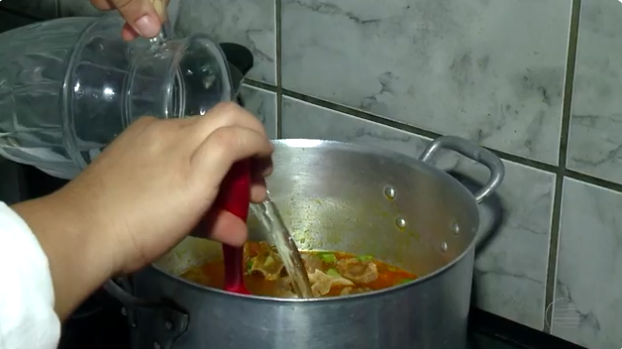 Com os temperos refogados, inclua na panela a rabada, mexa bem e adicione água suficiente para cobrir a carne. Deixe cozinhar na pressão por aproximadamente 30 minutos.