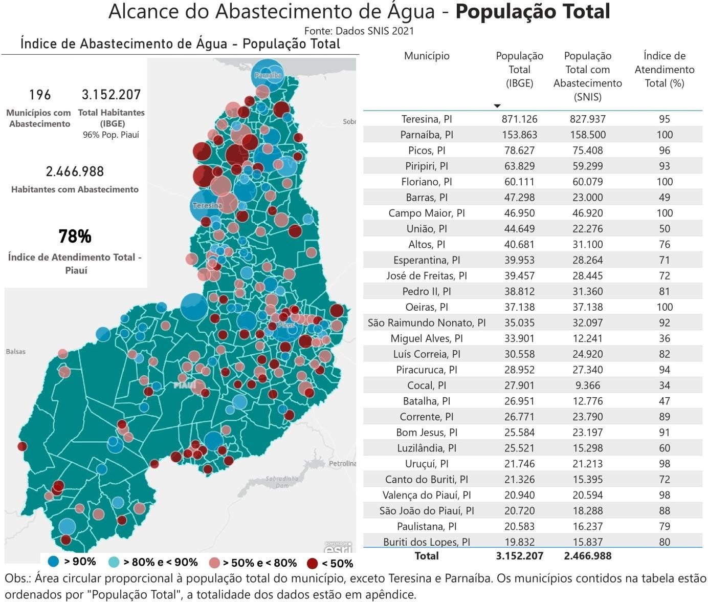 Dos 224 municípios catalogados, apenas as cidades de Parnaíba, Oeiras, Floriano e Campo Maior têm 100% de acesso à água. A capital Teresina possui atendimento de 95% da população. As cidades de Cocal, com 34%, e Miguel Alves, com 36%, têm os piores índices de abastecimento, respectivamente.