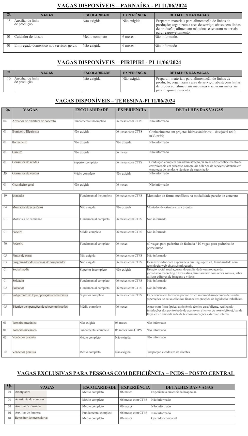 Conforme o quadro, 70 vagas são para pedreiro e 50 para consultor de vendas, além de vagas exclusivas para pessoas com deficiência (PCDs). Existem vagas também para as cidades de Parnaíba e Piripiri.