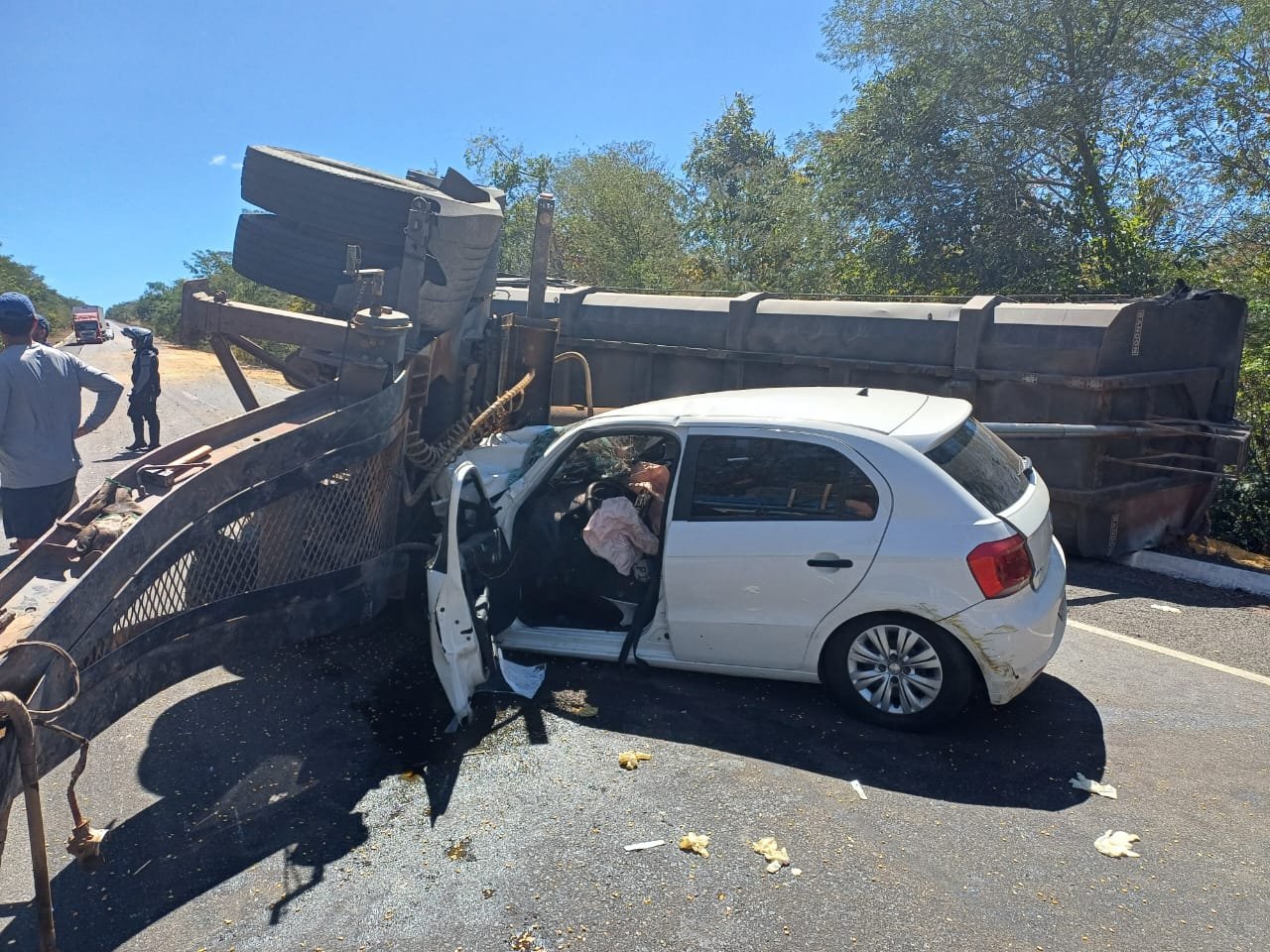 Uma carreta carregada de milho tombou e atingiu um veículo de passeio, modelo Gol,  na manhã deste domingo (14), na BR-316, em Inhuma, Sul do Piauí.