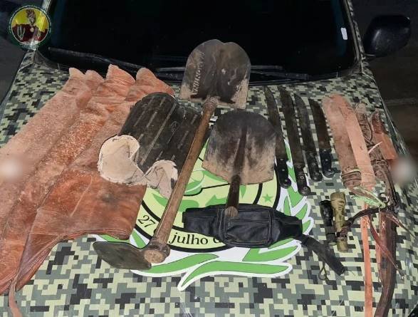 Durante o flagrante, os policiais apreenderam quatro lanternas, três peneiras, uma pá, um instrumento híbrido (pá e enxada) e quatro armas brancas (facão, do tipo “corneta”).
