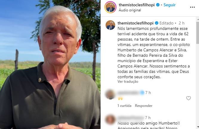 “O Brasil está triste com a tragédia, mas também os familiares e os amigos do município de Esperantina, lamentam esse terrível acidente”, disse o vice-governador.