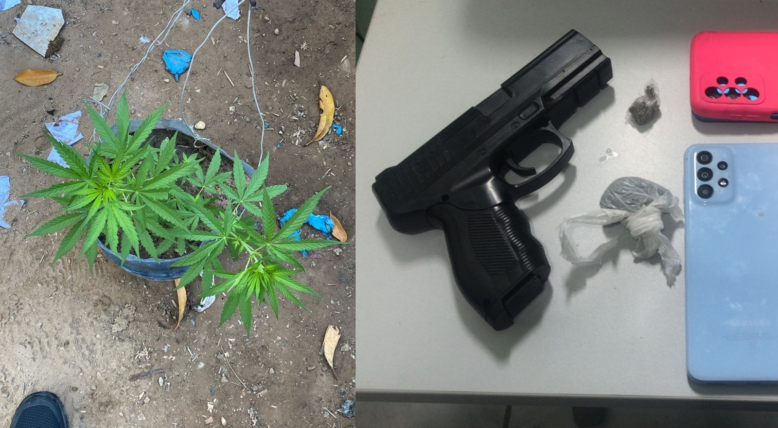 Segundo a Polícia Civil, durante o cumprimento dos mandados, o homem, identificado como V. V. do N., fugiu por um buraco na parede do quarto do casal. Na residência foram apreendidos um celular com restrição de roubo, um simulacro de arma de fogo, um arbusto e duas porções de maconha.
