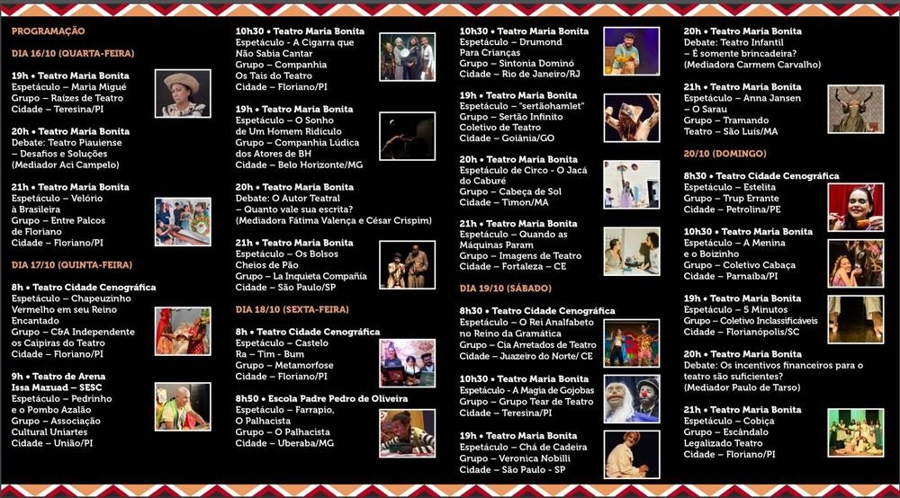 No período de 16 a 20 de outubro, grupos de diversos estados se apresentam em Floriano com programação adulta e infantil, durante o tradicional Festival Nacional de Teatro do Piauí, que chega à sua 12ª edição.