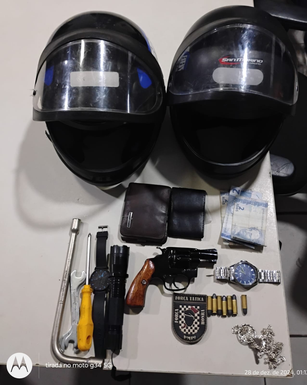 “Também foram apreendidos diversos objetos, incluindo dois relógios de pulso, colares e pulseiras de prata, capacetes, uma lanterna e documentos pessoais dos suspeitos”.