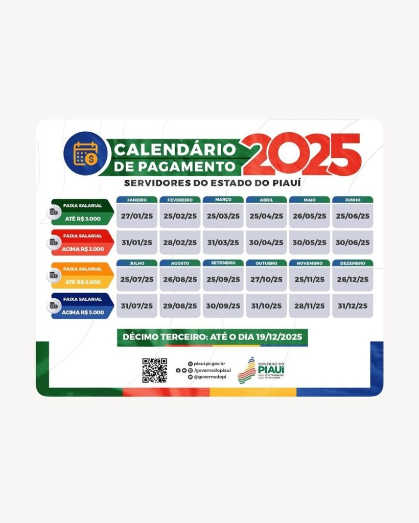 O governador Rafael Fonteles divulgou nas suas redes sociais a tabela de pagamento dos servidores estaduais de 2025, na tarde desta segunda-feira (13). A Secretaria de Fazenda havia anunciado que a divulgação aconteceria nesta terça (14). Os pagamentos ocorrerão conforme a faixa salarial em que cada servidor se enquadra.