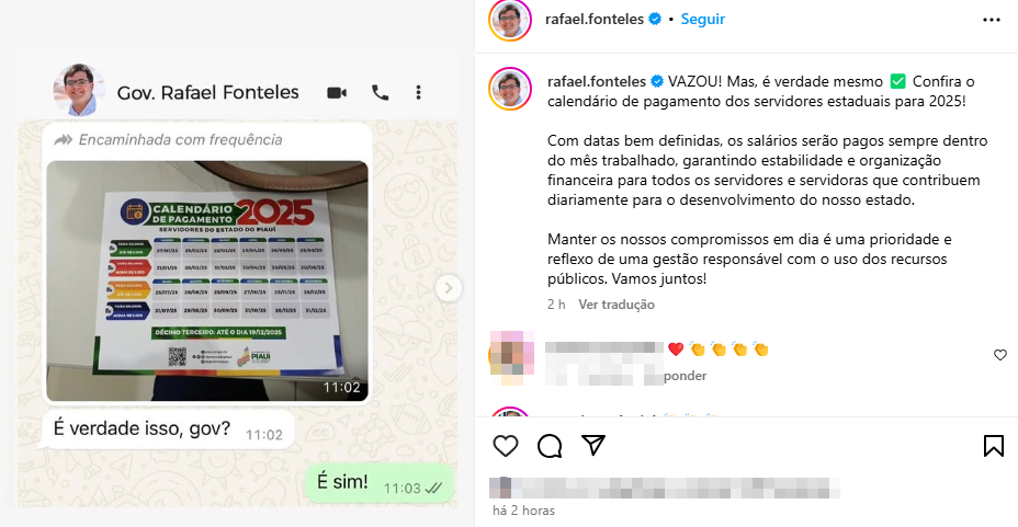 O governador Rafael Fonteles divulgou nas suas redes sociais a tabela de pagamento dos servidores estaduais de 2025, na tarde desta segunda-feira (13). A Secretaria de Fazenda havia anunciado que a divulgação aconteceria nesta terça (14). Os pagamentos ocorrerão conforme a faixa salarial em que cada servidor se enquadra.