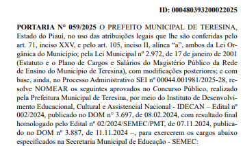 O ato formal de nomeação foi autorizado pelo Prefeito de Teresina, Sílvio Mendes, e assinado pelo Secretário Municipal de Educação, Ismael Silva. A medida é uma importante etapa no processo de melhoria da infraestrutura educacional da cidade e no compromisso da gestão com o futuro da educação.