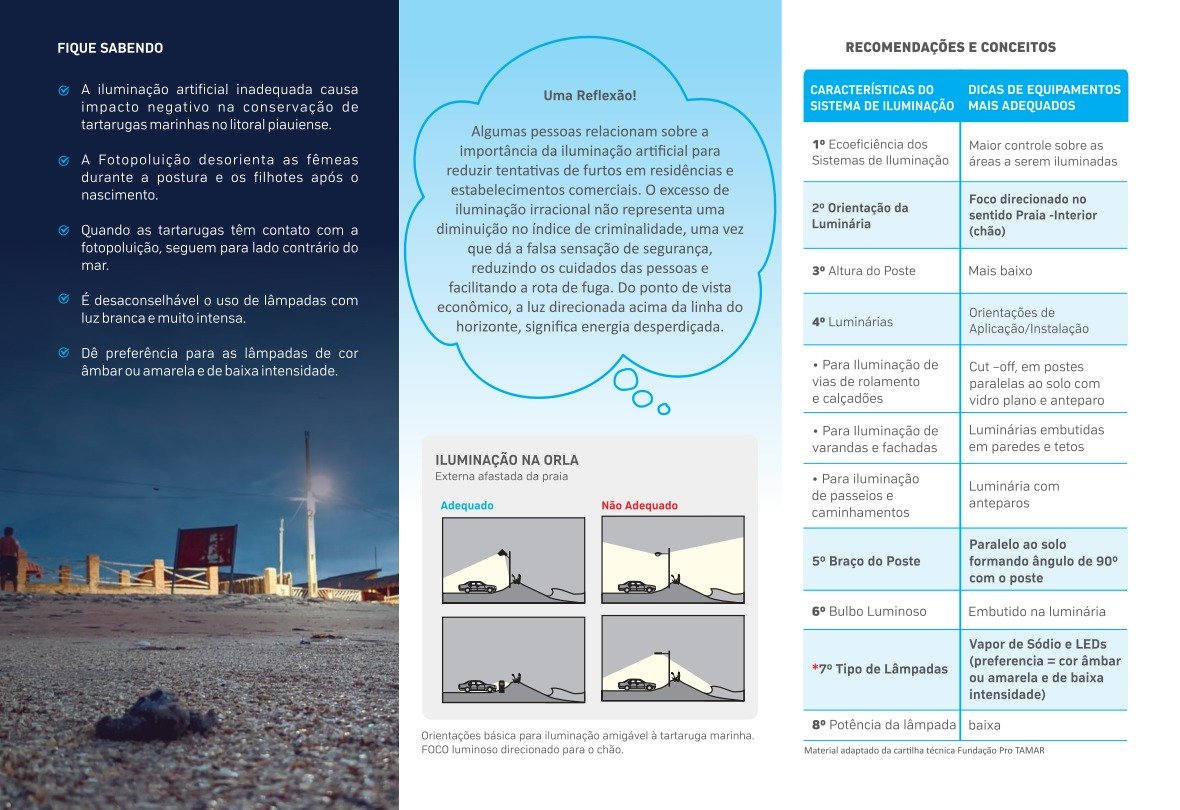 Para evitar a fotopoluição e que mais filhotes errem o caminho do mar, o Instituto Tartarugas do Delta recomenda dar preferência para lâmpadas de cor amarela e/ou âmbar e de baixa intensidade.